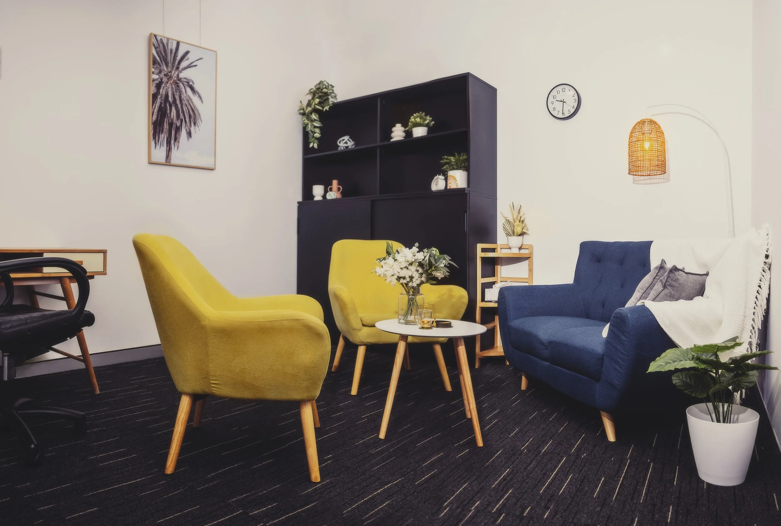 The room is appointed with storage cupboards for non-confidential items, desk and office chair, as well as 3-seater couch and two arm chairs